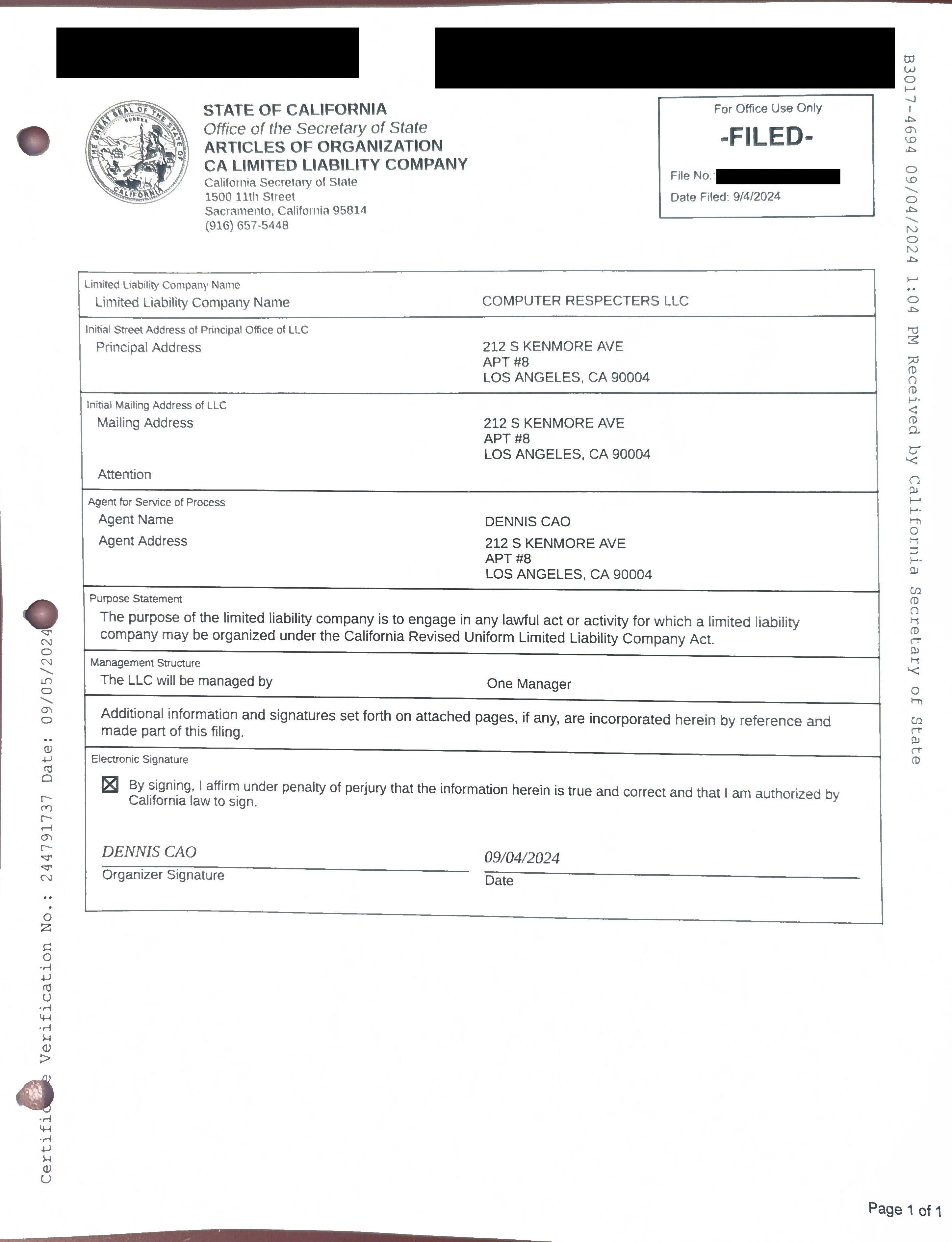The following documents verify the legal standing of Computer Respecters LLC as the parent entity of Dian Nao Software. Click any document to open the full-resolution image.