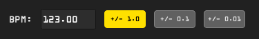 The BPM change section is a 3 way toggle that lets you choose one of three BPM adjustment values: +/-1.0, +/-0.1, or +/-0.01 (which you can cycle between using hotkey Shift + Left or Shift + Right).