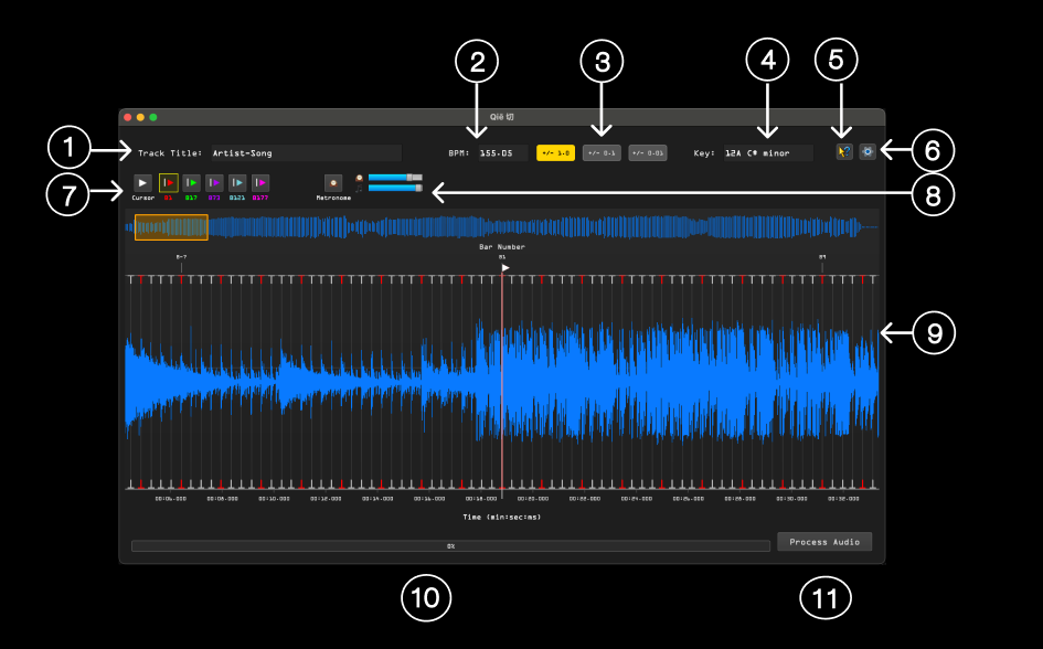 IMPORTANT: If you just want stems from Qie, and don't care about creating perfectly segmented 8 bar loops for your library, then all you need to do is hit the Process Audio button. Otherwise continue on and learn the GUI.