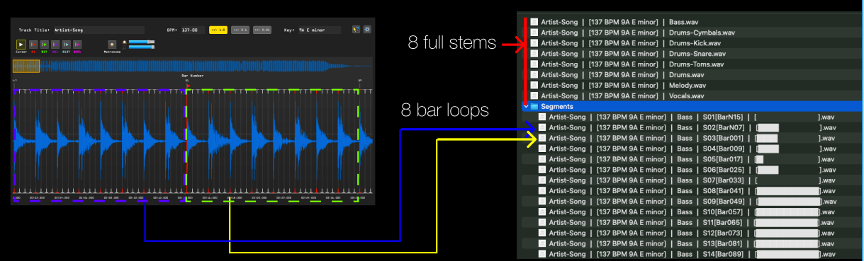 Qie used your "B1" location along with your BPM Value to cut forwards and backwards in time to create 8 bar loops (labeled by BPM and Key). The output segments folder has a numbering system so your 8 bar segments are in order, from the beginning of your song to the end of your song.
